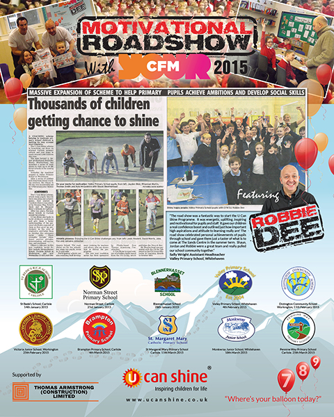"The U Can Shine motivational road show was a wonderful 10 week series of high energy, inspirational workshops visiting schools all over Cumbria. Building children’s confidence to believe in themselves, talk about their hopes for the future and what jobs they’d perhaps like to do was brilliant! Thank you to all schools, teaching staff, mums, dads and many others all connected to school communities who took part. It was an incredible privilege to be part of, meet you all... and we had a tremendous amount of fun doing it!"
